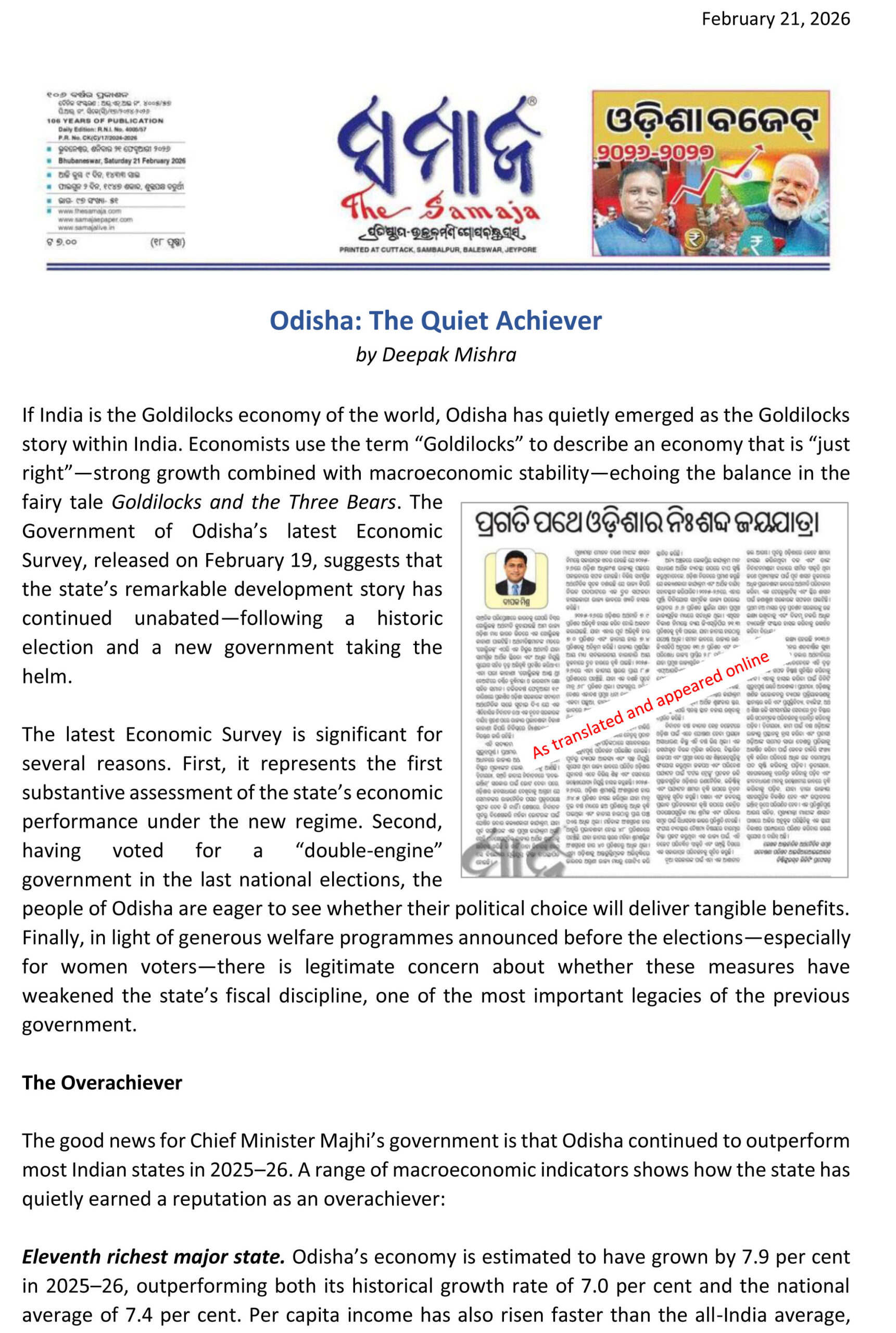 February 21, 2026 View past Op-eds Odisha: The Quite Achiever Source: The Samaj (Odiya newspaper) View past Op-eds